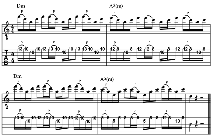 How To Play Like Metallica Seite 4Doch es ist nicht nur die markige Rhythmus-Gitarrenarbeit, die den Metallica-Sound ausmacht. Kirk ist sehr wohl in der Lage, auch durch seine heißen Leads zu überzeugen. Neben coolen Pentatonic Runs setzt er hierbei sehr häufig auf den interessanten Sound von Arpeggien (gebrochen gespielten Akkorden). Die Akkordfolge, die ich für unsere Experimente ausgewählt habe, besteht aus zwei Chords: Einem netten D-Moll und einem entzückenden A-Moll. Hör dir den Jam Track zum Thema einfach mal an: