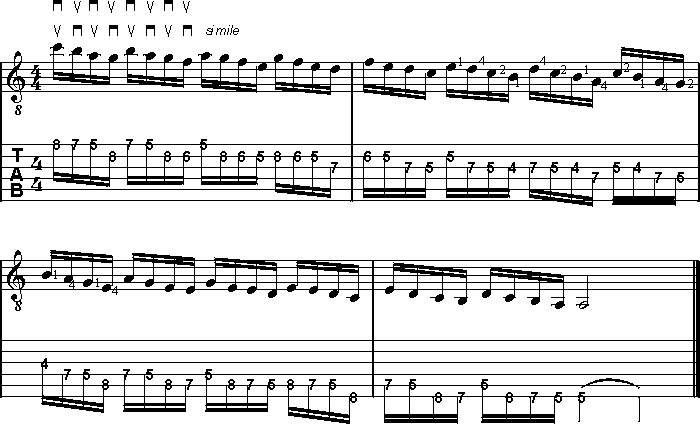Beide Studien hören auf den Namen "Sequenz Lick". Unter den Sammelbegriff Sequenzen fallen im allgemeinen all jene Licks, deren Basis von einer logischen Tonabfolge gebildet wird. In unserem ersten Beispiel besteht die logische Basis aus einer jeweils vier Töne umfassenden Folge. Dabei startet man mit dem höchsten Ton der Leiter und spielt von ihm aus vier Noten "bergab" (C B A G). Ist das erledigt springt man zurück zum zweithöchsten Ton (B) und verwendeten ihn als Start-Ton für eine weitere, vier Noten umfassenden, Linie (B A G F) etc. Unter Fachchinesen ist diese Sequenz übrigens unter der Bezeichnung Vierergruppen bekannt. Ist ja irgendwie auch logisch! Das Grundgerüst der zweiten Studie wird aus sogenannten diatonischen Terzen gebildet. Bildlich gesprochen überspringt man beim Spielen einer Tonleiter in diesem Stil, jeden zweiten Ton. In unserem konkreten Beispiel starten wir mit dem hohen C (8. Bund/E-Saite), überspringen das B (7. Bund/E-Saite) und spielen das A (5. Bund/E-Saite). Danach starten wir mit dem B (7. Bund/E-Saite), überspringen das A und spielen das G (8. Bund/B-Saite) usw.... Um das Ganze etwas appetitlicher anzurichten, haben wir dir die hier verwendete Tonleiter (A natürlich Moll) als übersichtliches Griffbild anzubieten. Guten Appetit!
