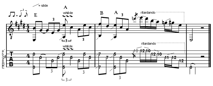 Und genau mit dieser Erkenntnis startet unsere Übungseinheit. In der folgenden Studie habe ich die typischen Blues-Chords mit einem coolen Pentatonik-Lauf auf den Punkt gebracht. Versuche als kleine Vorübung zunächst einmal nur die einzelnen Chords mit dem Slide-Röhrchen anzusteuern. Indem du das Slide im Umfeld des jeweiligen Zielakkordes hin und her bewegt, bekommst du das typische Vibrato des Slide-Spielers. Außerdem kann man so anfängliche Intonationsprobleme ein wenig kaschieren.