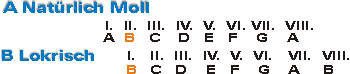 Übrigens: Startest du die A Moll Skala nicht, wie üblich, vom Ton A aus, sondern wählst das B (Grundton des Bm7b5 Akkordes) als Ausgangspunkt, so erhältst du eine Tonleiter, die in Fachkreisen den Namen Lokrisch trägt. Sie gehört zum Clan der berühmt berüchtigten Kirchentonleitern. Der informierte Engländer spricht in diesem Zusammenhang auch gerne von Modes.