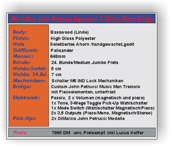 Die MusicMan John Petrucci 7-String Signature Gitarre-Vorhang auf und keine Tricksein Test von Hansi Tietgen Kaum ein Gitarrist ist musikalisch wie spieltechnisch so komplett ausgestattet wie Dream Theater Saitenakrobat John Petrucci. Sieben Band-Alben prallgefüllt mit Songs, die es in sich haben, zahlreiche Readers Poll-Siege in den angesagtesten Gitarrenmagazinen der Welt und einige aufregende Sideprojekte (unter anderem mit Bass-Gott Tony Levin) sind die Früchte eines Weges, der sicher auch in Zunkunft noch jede Menge Überraschungen für die Freunde innovativer Rock-Musik bereithalten wird. Eines dieser typischen Petrucci Events bahnte sich bereits im vergangenen Jahr an, als die Business-Buschtrommeln vermeldeten John hätte, gemeinsam mit den erfahrenen Music Man Designern damit begonnen, einen Prototyp für eine neue Signature-Gitarre zu entwickeln. Mittlerweile ist es bestätigte Realität. Mit dem ihm auf den Leib geschneiderten John Petrucci Modellen ist Sir John ab sofort ein offizielles Mitglied der erlauchten Music Man Family. KK- Korpus und KonzeptSeinen Spielgewohnheiten entsprechend, sind zwei Basisversionen im Angebot- ein 6-saitiges Modell und die uns zum Test vorliegende 7-saitige Variante. Anders als bei Music Man Signature Modellen wie der "Steve Morse" oder der "Luke" für die, in Sachen Formgebung, die bewährte Silhouette Baureihe Pate stand, ging man beim Design der "Petrucci" neue Wege. Eine Maßnahme die schon darin begründet liegt, dass John's Spielstil und nicht zuletzt auch die Musik seiner Band Dream Theater, dem zum Einsatz kommenden Instrument jede Menge Sonderfeatures abverlangt. Klar, dass sich solche Ansprüche unmittelbar in der Form und Ausstattung eines entsprechenden Signature-Modells wiederspiegeln.
