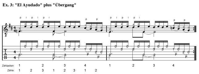 Wir können jetzt schon die Elemente von Ex.1 und Ex.2 zum Erstellen einer übergeordneten Studie benutzen. Zu diesem Zweck habe ich sie in einen Viervierteltakt eingebaut. "El Ayudado" wird in diesem Zusammenhang gleich zweimal hintereinander benötigt. Außerdem leitet der PO-Übergang den nächsten Takt mit dem Griff A7/4 ein.