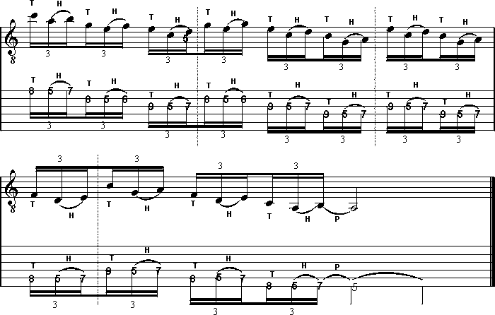 PG Workshop Special Tapping-Part IIIvon Hansi Tietgen Guten Morgen! Willkommen zum dritten Teil unseres großen Tapping Specials. In der aktuellen Ausgabe wirst du nicht nur erfahren, wie du die bisher gelernten Pattern in Verbindung mit Dur/Moll Skalen einsetzen kannst, sondern auch, wie man aus einem "gemeinen" Sechzehntel-Triolen Lick ein cooles Sechzehntel- bzw. (wer kann) Zweiunddreißigstel-Pattern bastelt. Viel Vergnügen! Auch diesmal wollen wir dich, in gewohnter Weise, zunächst mit einem passenden Grund-Pattern versorgen. Es basiert auf Tönen der C-Dur/A-Moll Skala und entspricht in seinem Ablauf unserem althergebrachten Tapping-Lick aus Folge Numero Uno. TAP 3 Basis-Pattern hören